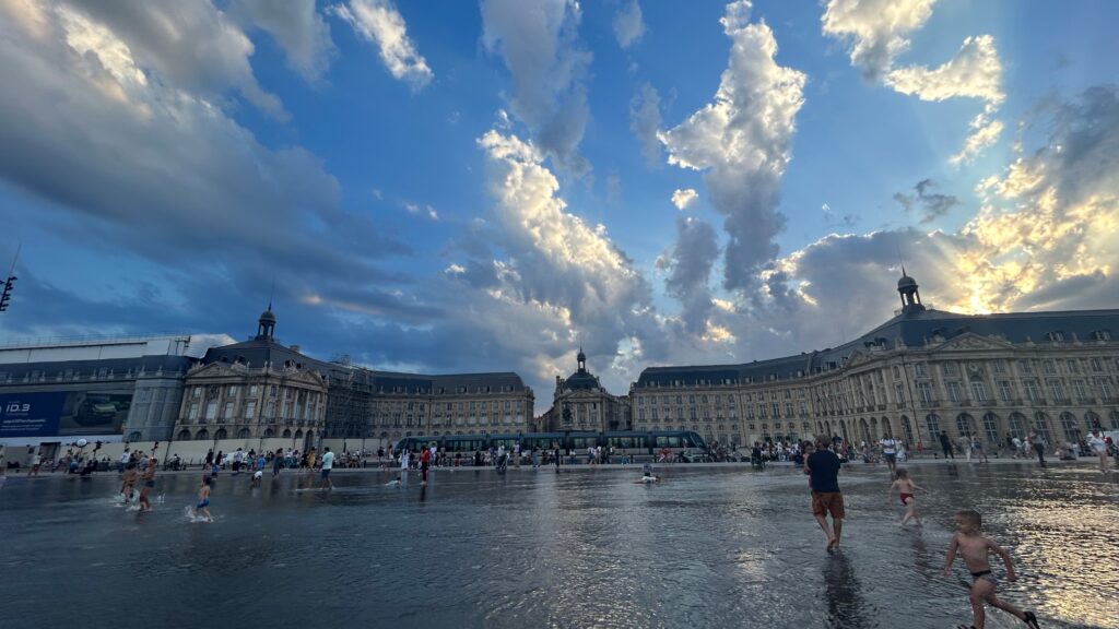 レストランやカフェが並ぶエリアを抜け、中心部の水鏡(ミロワール・ドー)の広場に辿り着いた。夕暮れ時、水面に映し出されるボルドーの街並みは息をのむほど美しい。