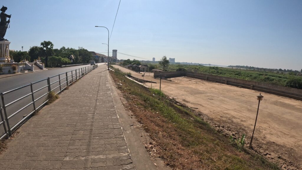 ホテルを出てすぐ、大河メコンを望む大通りに出た。あいにく河原まで下りることはできなかったが、川の向こうにはタイの街並みがすぐそこに見える。