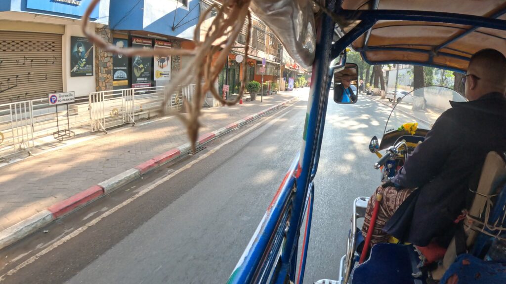 街角でトゥクトゥクを拾い、往復の約束を取り付けて走り出す。風を切って進むトゥクトゥクから眺める雑多な街並みは、東南アジアに来たことを改めて実感させてくれる。