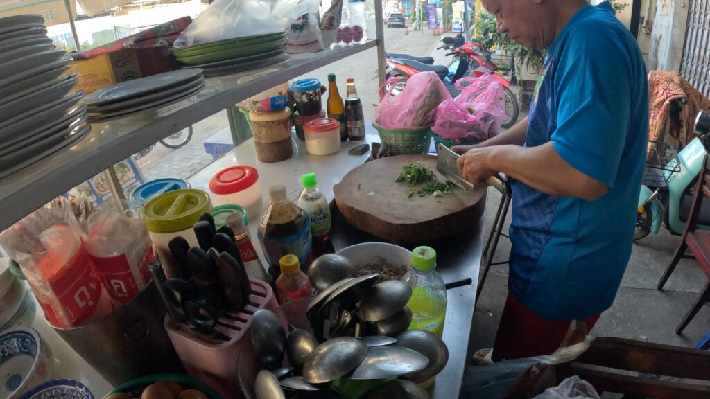 注文したのは「豚肉のラープ」。調理場はなんと店の外。親父さんが炭火でご飯を炊き始め、蒸籠から真っ白な湯気が立ち上る。