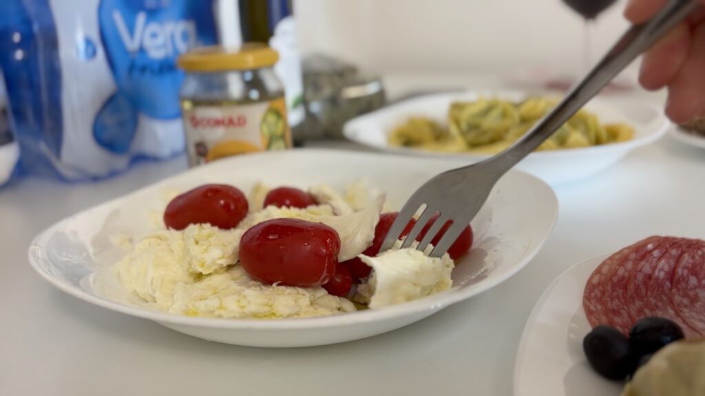 フレッシュモッツァレラ、チェリートマト、カッペラッチ、ハム、オリーブ、カルチョフィ、パン。