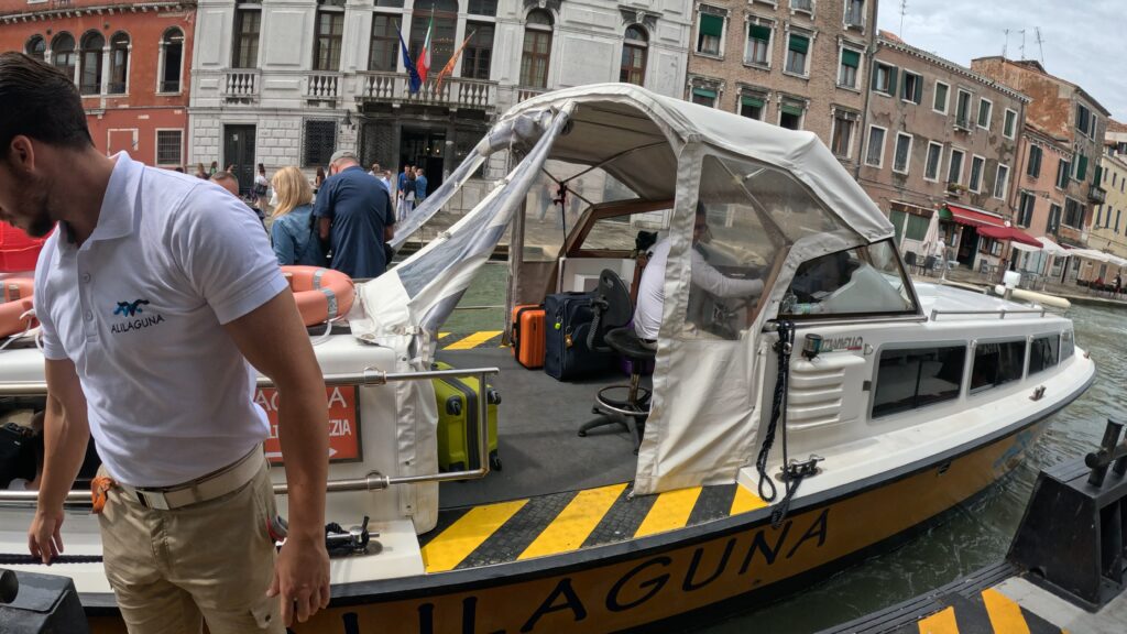 幸いにも雨が上がり、停留所へ向かうと程なくしてアリ・ラグーナ社の水上バスがやってきた。念のため乗務員に行き先を確認し、いよいよ乗船。